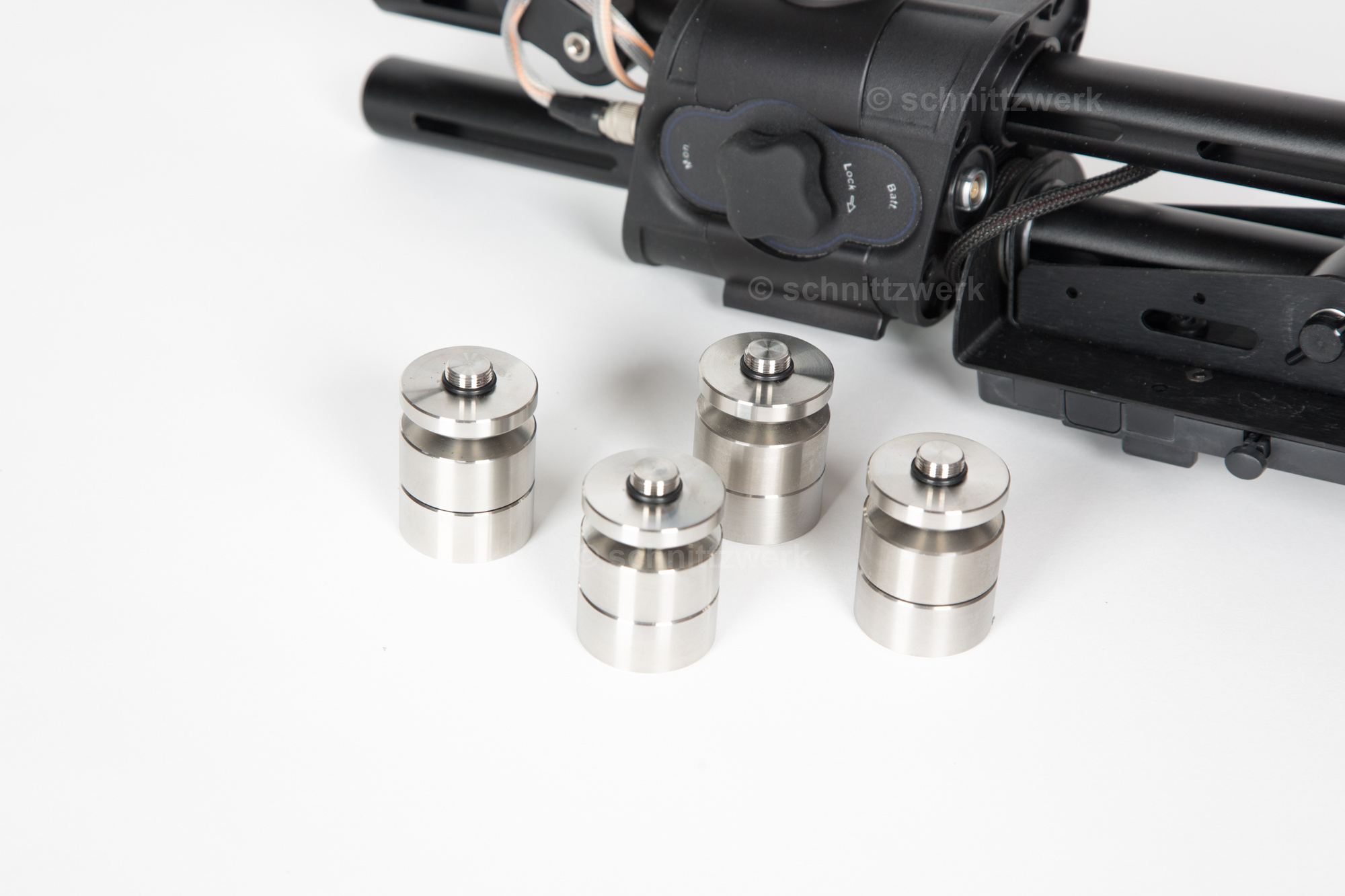: Balance control via standard ¼-20 mounting hole at the base of the sled and additional balance weights.
