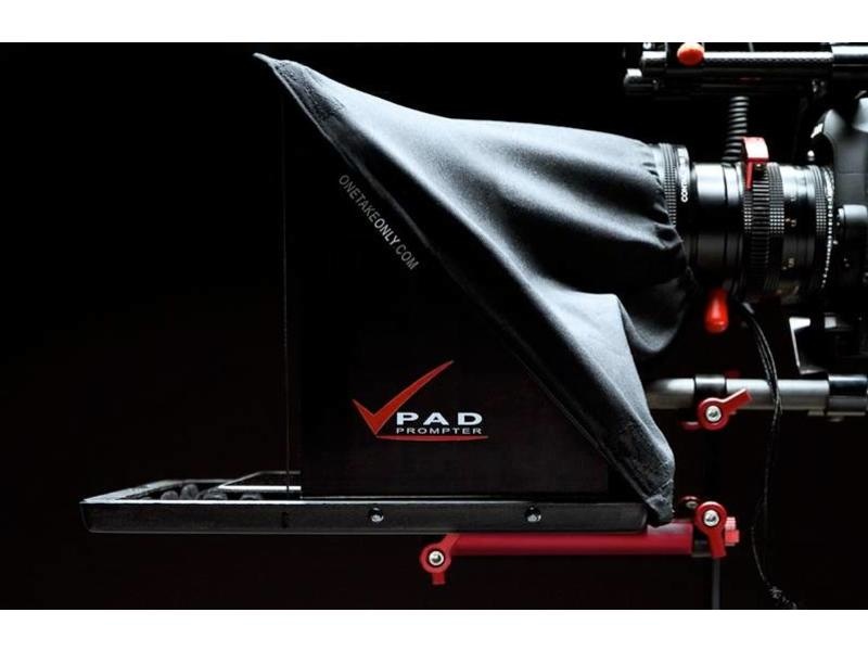 Once you've got the Pad Prompter mounted on a light stand, lift open the top cover and insert your tablet in its place. Then place your camera on a tripod behind the Pad Prompter, position your lens right behind the lens opening on the top cover, and you're ready to go. The included 70/30 beamsplitter glass installs into the top cover right in front of the lens opening and can be kept in there even during transport. A cloth hood is also included for covering the lens opening to block unnecessary light. It is designed to be attached to the top cover by optional touch fasteners.
